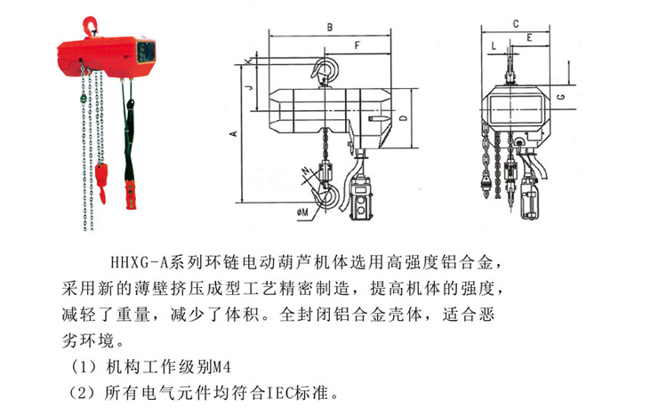 環鏈電動葫蘆HHXG-A型0.125-2T的機體采用了高強度鋁合金,通過最新的薄壁擠壓成型工藝生產制造,高強度的材料和最新的成型技術使產品強度增加,重量減輕,體積減少,安全性增高,可適應各種惡劣環境。